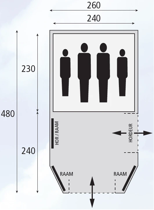 De Mustang 260 RSTC is familie van de Mustang 220 RSTC. Deze tunneltent heeft meer ruimte en opbergmogelijkheden dan zijn kleinere broertje en is daardoor beter geschikt voor 3 volwassenen of voor 2 volwassenen en 2 kleine kinderen. De stahoogte van deze tent is 2 meter zodat je rechtop kunt staan en manoeuvreren.