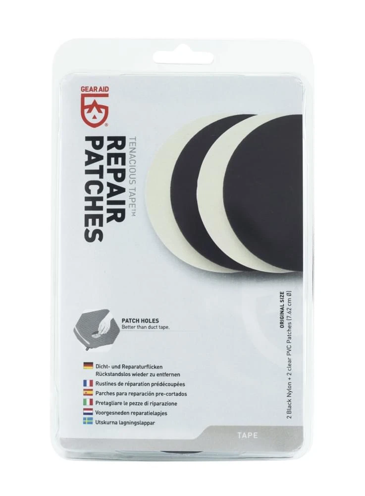In deze reparatieset van Gear-Aid vind je 4 ronde patches. Twee zwarte nylon patches en twee transparante PVC patches. Deze zijn zelfklevend en ideaal om gaten en scheuren te repareren van bijvoorbeeld de tent, slaapzak, regenkleding enzovoort. De reparatie patches hebben een doorsnede van 7,6 cm.