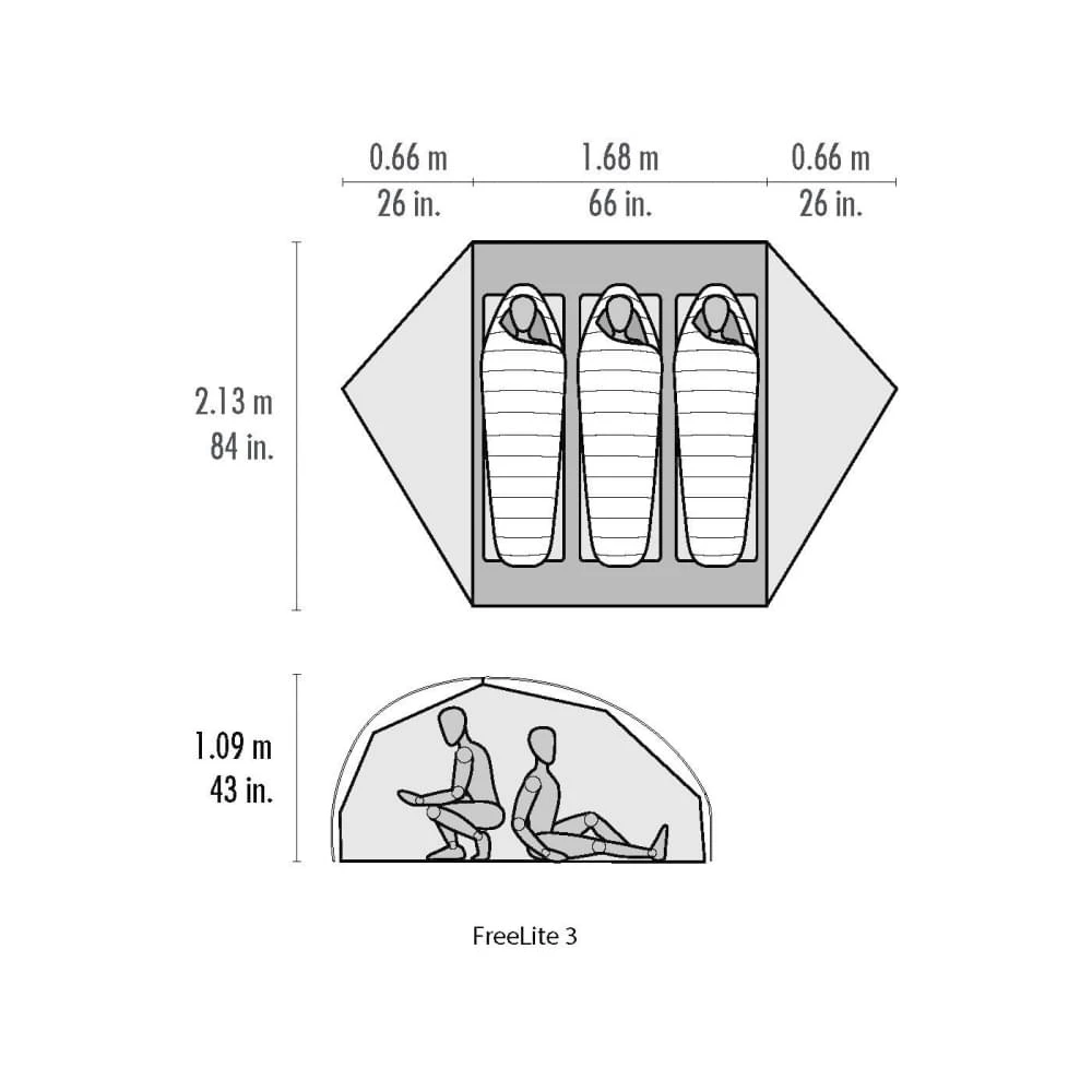 In deze FreeLite 3 heb je voldoende ruimte om met 3-personen te slapen mits je allemaal een Exped M of een Therm a Rest R slaapmat gebruikt. Je kan er ook voor kiezen om deze tent met 2-personen te gebruiken. Je hebt dan een zee van slaapruimte en ook nog extra om je bagage ook daadwerkelijk in de binnentent te stallen.